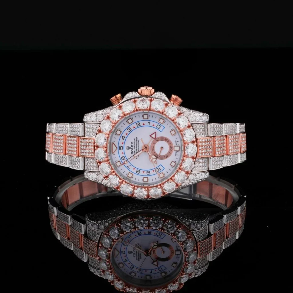 This watch is an absolute statement piece. The fully iced-out dial and bezel catch light from every angle, delivering serious luxury and bold hip-hop energy.