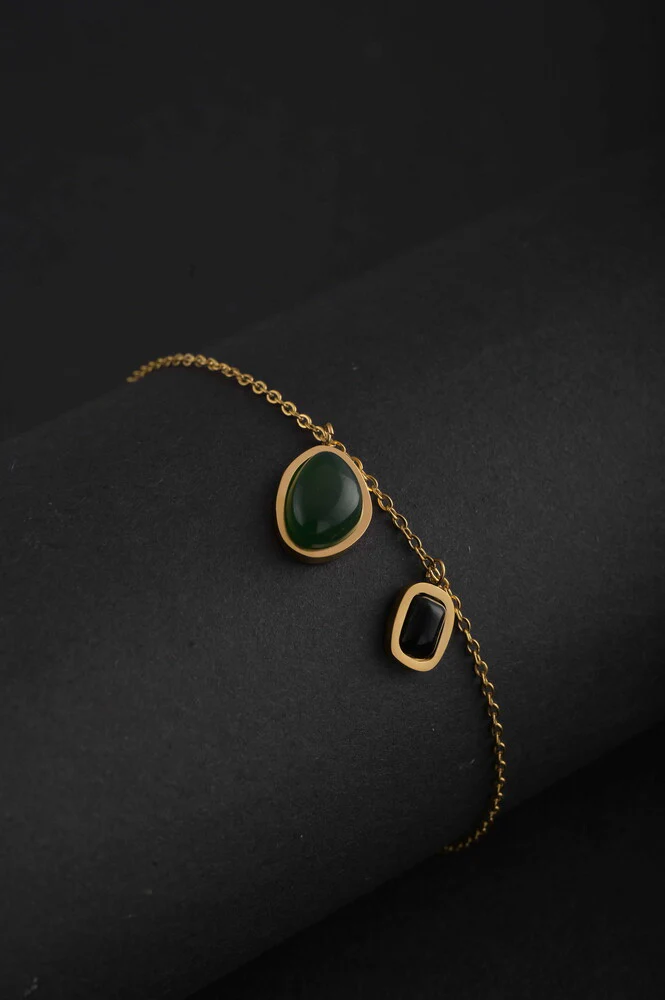 Add a pop of color and modern charm to your look with this stylish dual-stone gold chain anklet for women. Crafted in a polished gold-tone finish, the anklet features a delicate chain accented with two bezel-set stones in contrasting shades—one deep green and one classic black—creating a balanced and contemporary aesthetic.
