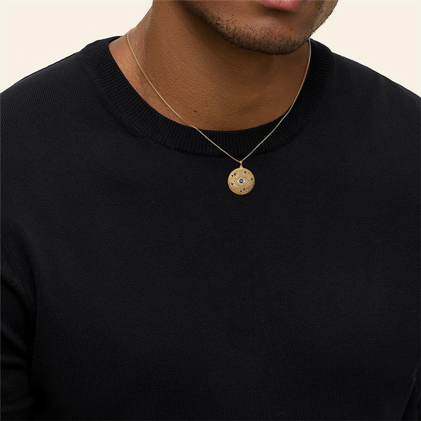 This striking necklace showcases a round medallion pendant with a richly textured surface, centered around a symbolic eye motif. The eye is framed with sparkling clear stones and accented by deep blue stones scattered across the medallion, creating a celestial, star-like effect.