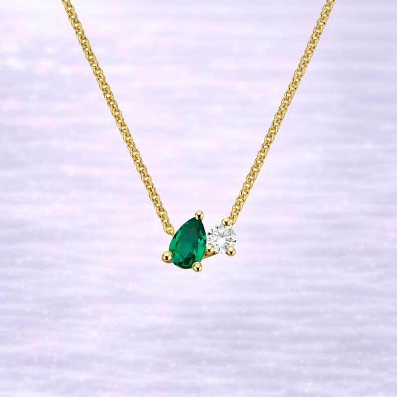 This elegant necklace features a two-stone composition that celebrates balance and connection. A pear-shaped green gemstone brings a touch of nature-inspired richness, while a round clear stone adds timeless brilliance. Set side by side, the stones symbolize harmony, growth, and lasting bonds.