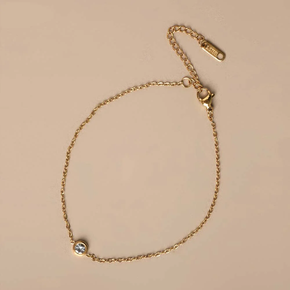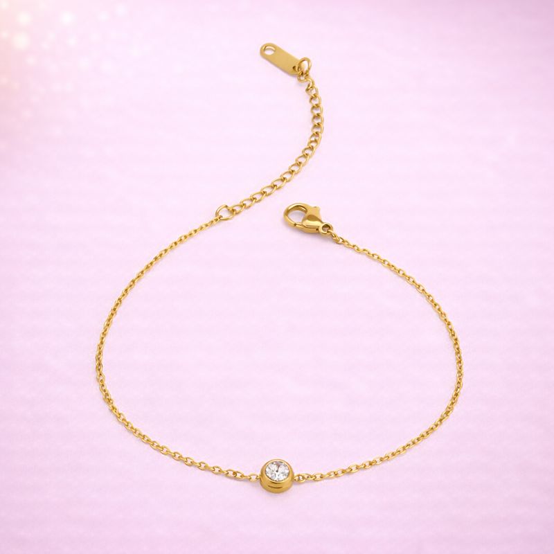 Add a touch of subtle sparkle to your everyday style with this delicate single-stone gold chain anklet for women. Crafted in a polished gold-tone finish, the anklet features a fine, lightweight chain accented with a small bezel-set white stone at the center, creating a refined and graceful look.